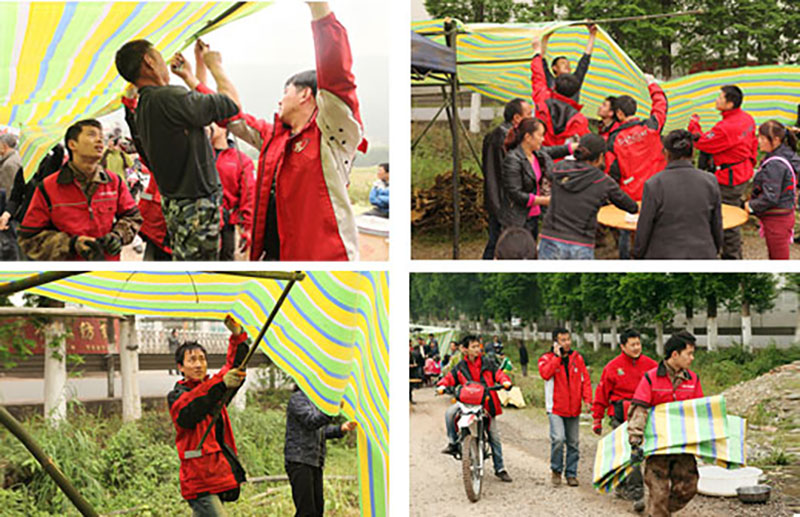 4月22日早上,全體救護隊員集體趕往帳篷物資購買地購買物資。購買了10包彩條布(每包50米),雨衣、紙巾等災區必備物資。此后,車隊沿著雅安到蘆山縣城一線,開始挨村搜索,專門給災民撘帳篷。說是帳篷,其實就是用油布做頂,就地取材做支架為災民搭建臨時的家。這是經濟又實在的做法,災民在這樣的帳篷下,可以居住,也可以燒火做飯,比真正的救災帳篷要實用得多。