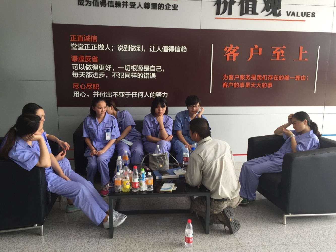(教官對身體不適的員工進行場外輔導)