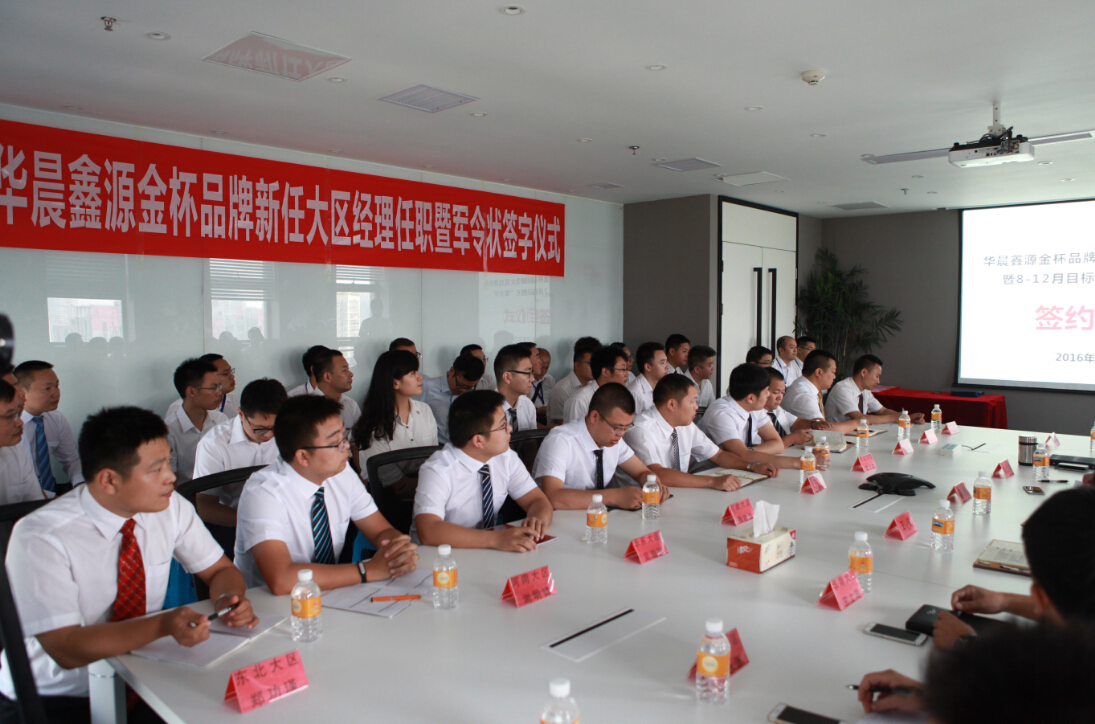(華晨鑫源金杯品牌新晉大區(qū)經(jīng)理任命暨8-12月目標(biāo)責(zé)任“軍令狀”簽字儀式會(huì)場)