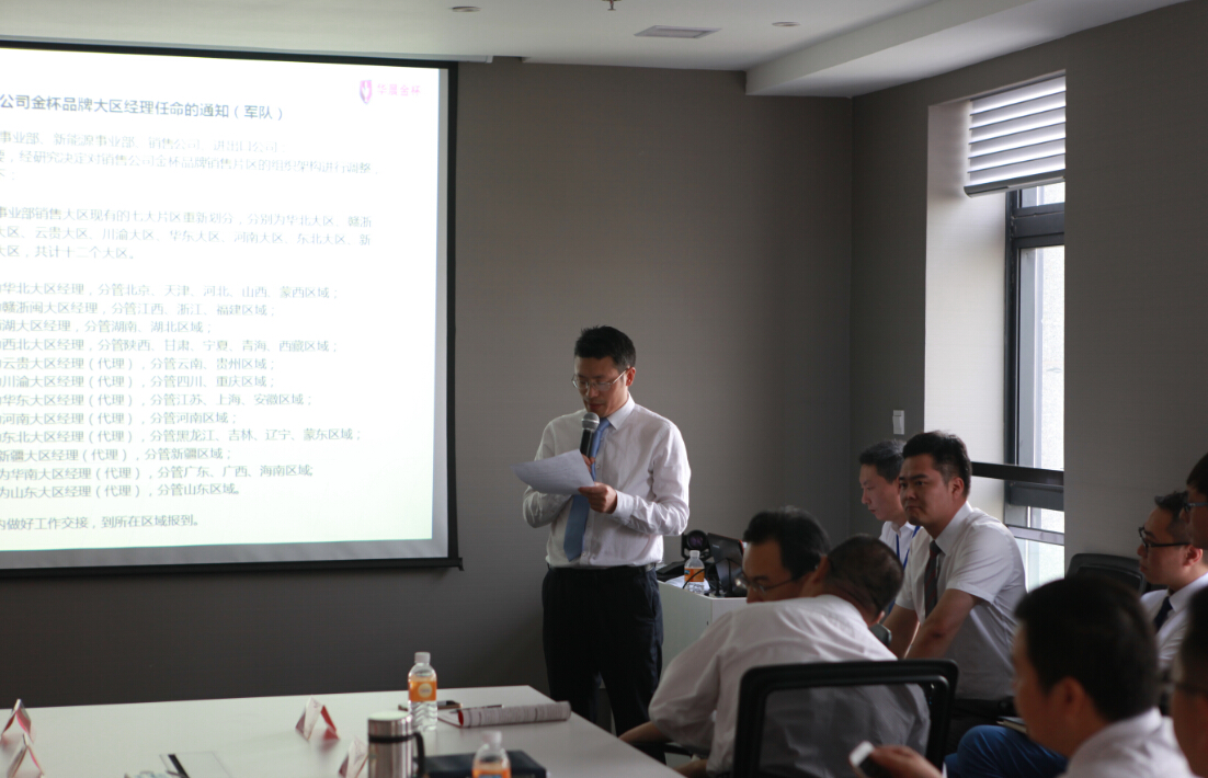 會(huì)議開始,汽車銷售公司副總經(jīng)理周江文宣布了金杯品牌新晉12名大區(qū)經(jīng)理任命名單;12位新晉大區(qū)經(jīng)理其中10位是通過公開競聘產(chǎn)生,另外2名大區(qū)經(jīng)理通過社會(huì)招聘加入銷售團(tuán)隊(duì)。