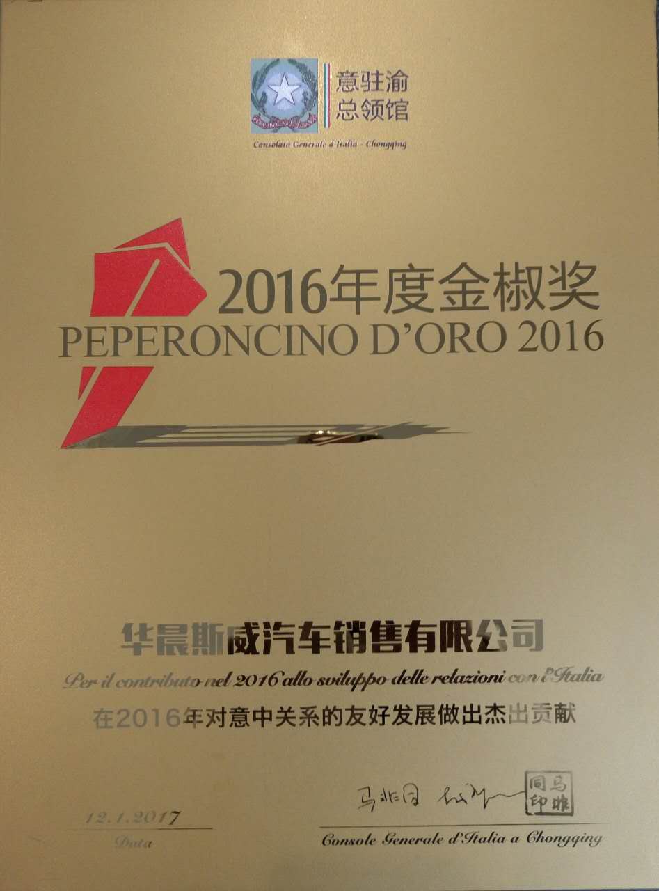 領事館2013年末成立以來,每年都舉辦金椒獎頒獎典禮以表彰為意大利與中國西南地區做出杰出貢獻的企業和個人華晨斯威汽車銷售有限公司2016年大力支持領館的各項文化推廣活動,在第三屆“情系意大利之秋”文化季上,SWM斯威汽車X7以意式經典優雅亮相,贏得一致好評。意使館將金椒獎——最佳文化合作伙伴獎單位頒發給華晨斯威汽車銷售有限公司,希望與華晨斯威汽車銷售有限公司早2017年建立更加良好的合作關系