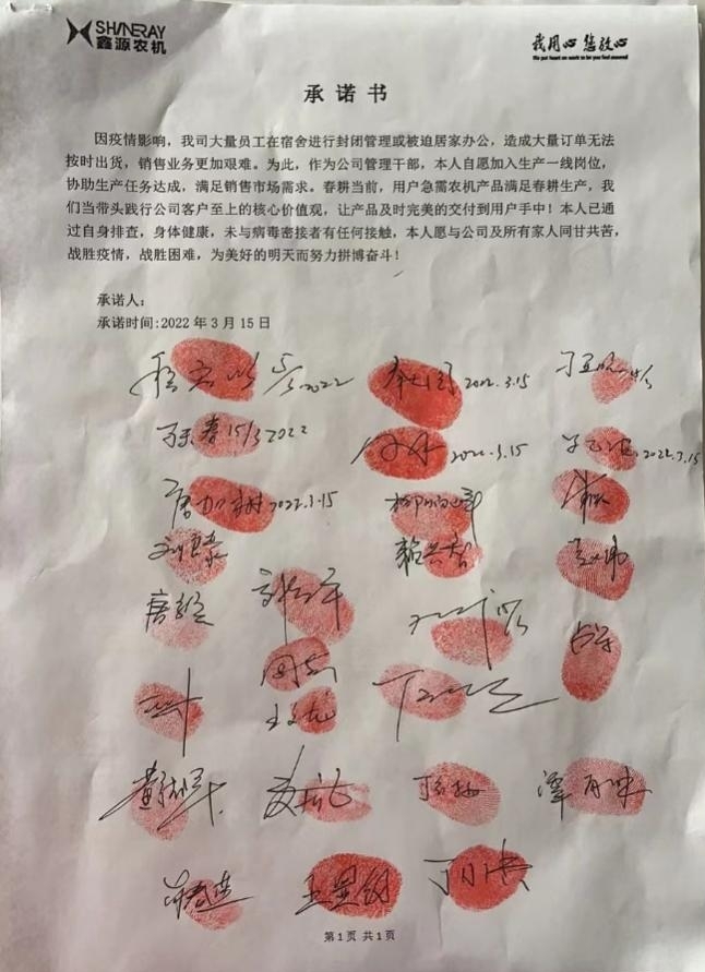 農(nóng)機公司按照疫情防控及復(fù)工復(fù)產(chǎn)的相關(guān)要求,一手抓疫情防控,一手抓復(fù)工生產(chǎn),管理團隊率先垂范、擔(dān)當(dāng)作為,確保生產(chǎn)進度能夠按期達成,用實際行動做到“兩手抓、兩手硬” 的具體要求,確保打贏這兩場戰(zhàn)役,最終能夠全面取得兩個勝利!