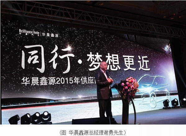 2015年4月17日,華晨鑫源以“同行,夢想更近“為主題的供應商大會在重慶麗笙世嘉酒店隆重召開,來自全國各地400余家汽車零部件供應商應邀出席。