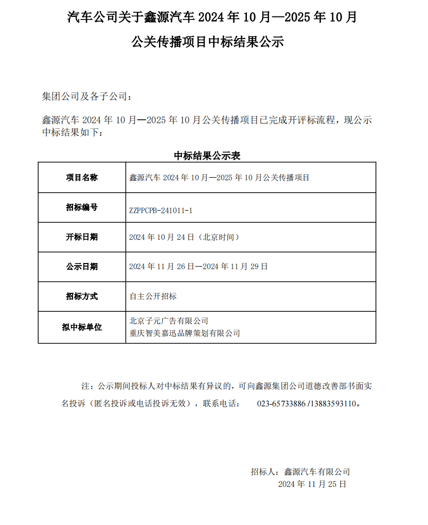 汽車公司關于鑫源汽車2024年10月-2025年10月公關傳播項目中標結果公示
