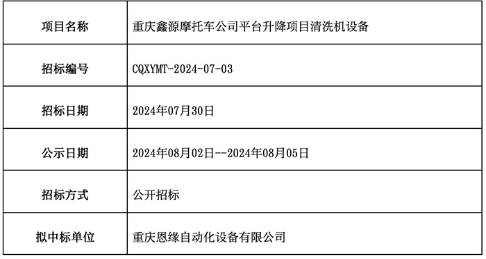 重慶鑫源摩托車公司平臺升級項目清洗機設備已完成招標流程,現(xiàn)公示中標結(jié)果如下: