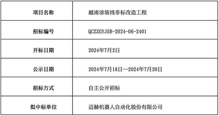 越南公司涂裝線非標改造工程項目已完成開評標流程,現公示中標結果如下: